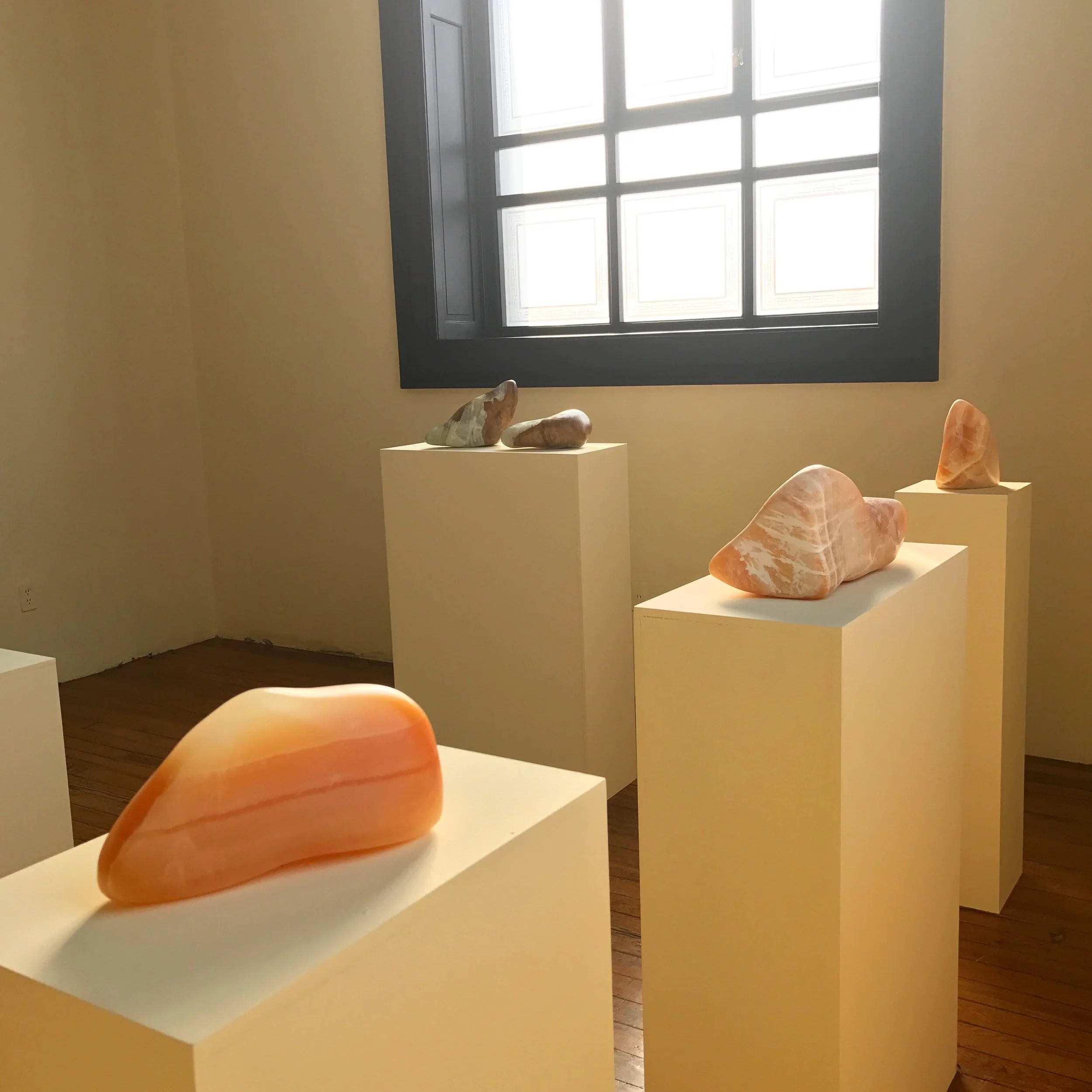 This exhibition showcases new sculptural works and installations created in her studio in Mexico City from the ongoing body of work Butterfly Double using Mexican materials, a series of carved abstract chrysalis forms in marble and onyx. Continuing with the theme of concealing and revealing not only in the conceptual or psychological context but also in the the physical material itself. In referencing stories, memories, objects of nature, the physical body or situations in the psyche, ultimately she creates abstract sculptural forms that convey or evoke essential dualities and sexuality.